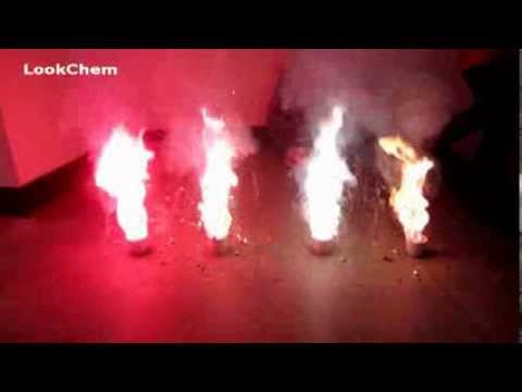 Cane sugar contains three elements: carbon, hydrogen and oxygen, it is flammable. When sulfuric acid drops down with potassium chlorate, which can generate the odd smelly chlorine dioxide gas: 3KClO3+2H2SO4=2KHSO4+KClO4+H2O+2ClO2↑Because the gas has strong oxidizability and can make the sugar burn violently. While adding magnesium powder, it will produce white fireworks. While adding barium nitrate, it will produce green fireworks.